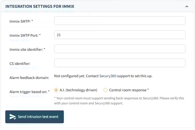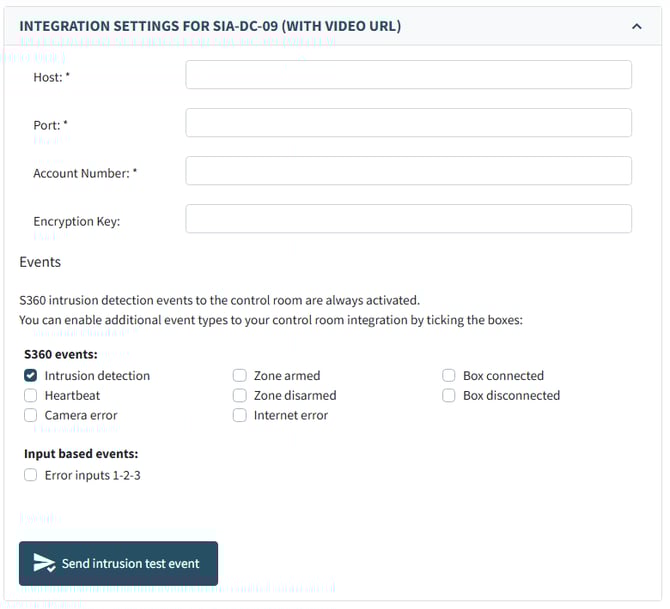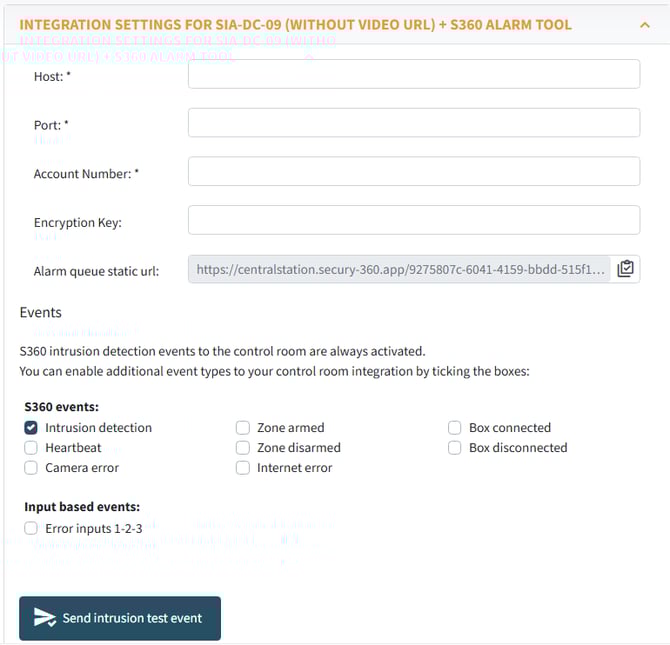 You can choose to use SIA-DC-09 with or without video URLs and activate the S360 alarm tool.
