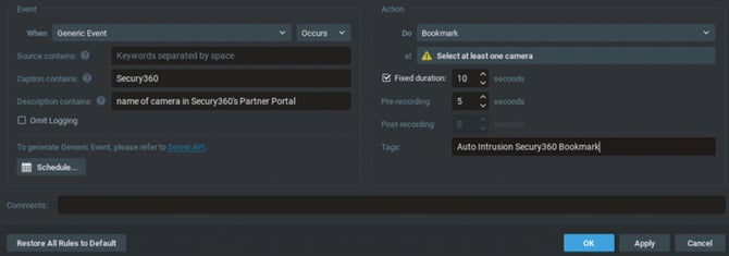 - Add an Event Rule in Network Optix to register detections as bookmarks: